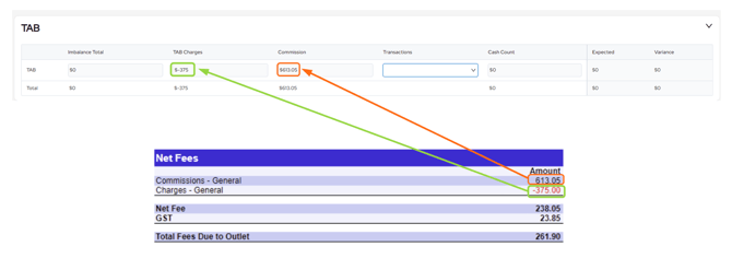 The TAB Weekly Fees & Commissions entry records the weekly charges and commissions for TAB trade. This process ensures that venue-level fees and commissions are accurately reflected in Cashup each week.