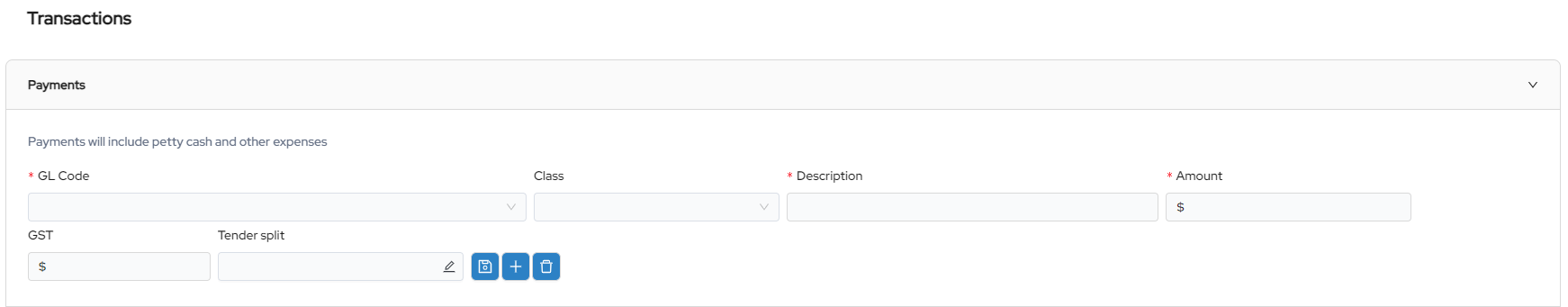 - GST - The GST calculated as per the payment record, this will automatically calculate GST and will need to be overridden for GST exclusive items. This should align with supporting documentation.