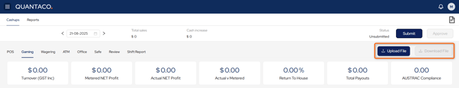 In Cashup > Gaming tab, click Upload File to auto-populate the following fields