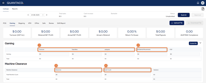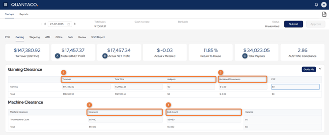 - Record the physical cash count from the machines in Gaming Machine Clearance