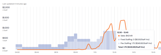 View sales (orange line) and staff hours (blue bars) in 15-minute intervals.