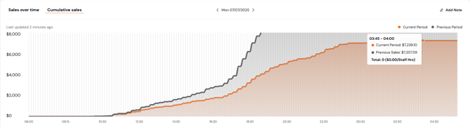 Shows a rolling total of sales throughout the day.